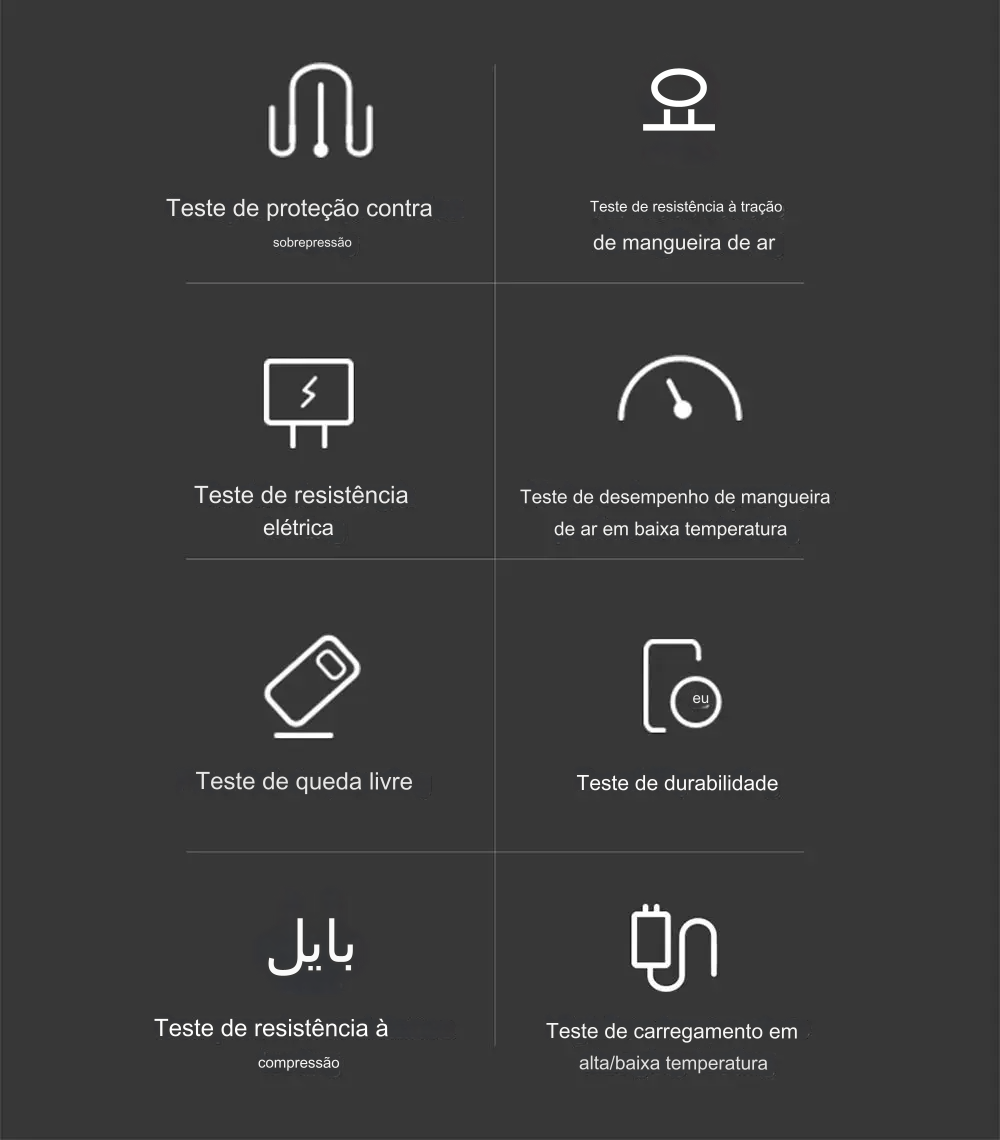 Oito testes rigorosos * para garantir a durabilidade: Teste de resistência à tração contra sobrepressão/teste de resistência à tração da mangueira/teste de resistência à compressão Teste de resistência elétrica/teste de desempenho de baixa temperatura da mangueira/alta/baixa temperatura/queda livre/durabilidade teste